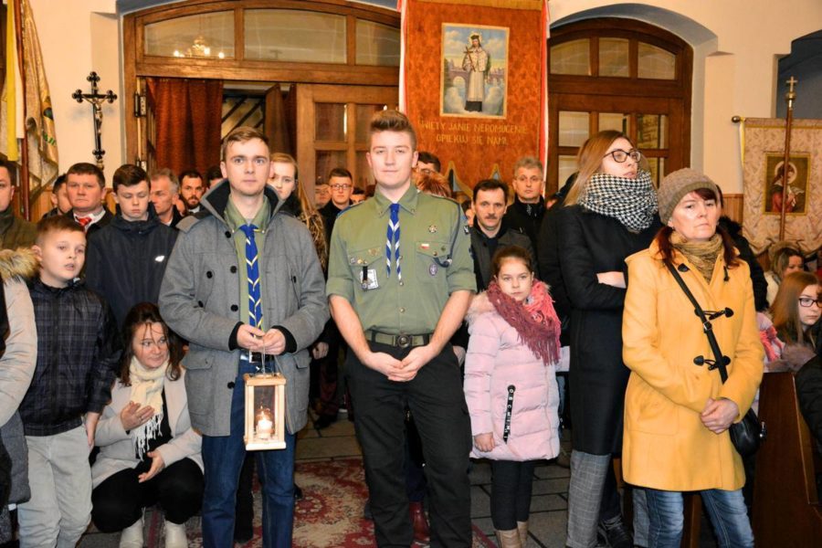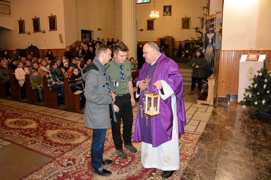 Przekazanie przez Harcerzy z Hufca ZHP Tarnów Betlejemskiego Światła Pokoju do naszej parafii.